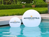 Benutzerdefinierte LED Poolleuchte als Leuchtwerbung, Lichtkasten mit Logo, beleuchtete Kugellampe, beleuchteter Schwimmkugel Firmenveranstaltungen