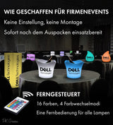 Unsere Lampen und Mittelstück-Leuchten sind ideal für Firmenveranstaltungen. Kein Zusammenbau ist erforderlich. Die Leuchtkörper sind ferngesteuert und besitzen 16 Farboptionen.