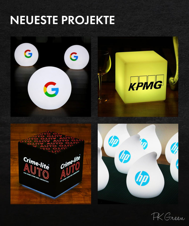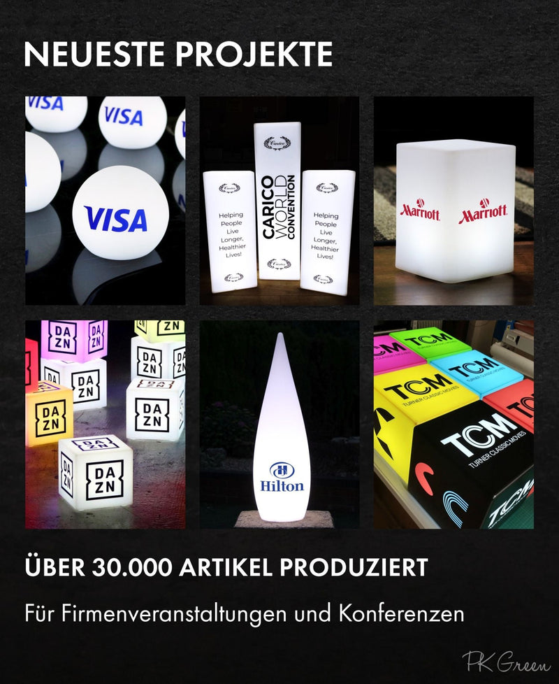 Kleinere Würfel eignen sich hervorragend als individueller Tischschmuck, während größere Lampen als Hocker, Sitzgelegenheiten und Tische verwendet werden können (sie sind stabil genug, um darauf zu sitzen). Sie können Ihr Logo als beleuchtetes Firmenschild somit als Blickfang nutzen.
